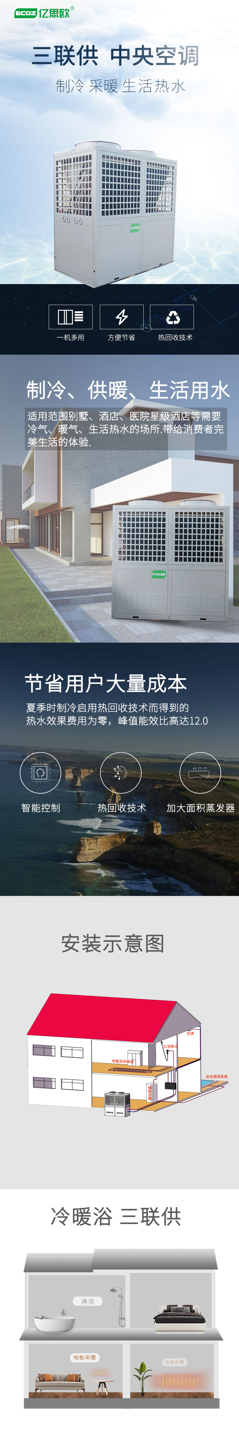 ECO億思歐研發(fā)的冷、暖、浴風冷三聯(lián)供系列機組綜合能效比在6.0以上,高效節(jié)能,適用于冷氣、采暖及生活熱水的高端別墅、酒店等.一機多用,不僅給人類帶來更多的方便之處,并且更